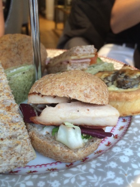 It came with cucumber fingers, mushroom quiche, a chicken bun, and other yummy savouries!