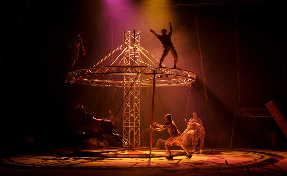 Race Horse Company turned the Theatre Royal stage into an abandoned fairground and proceeded to run riot on the equipment that was left there. Combined with the music they used, it gave the air of some guys coming back from a rave and happening upon this equipment. For me this added to the nervousness of the performance – I am aware that they are highly trained very skilled professionals, but their characteristics when interacting with each other sometimes suggested otherwise.