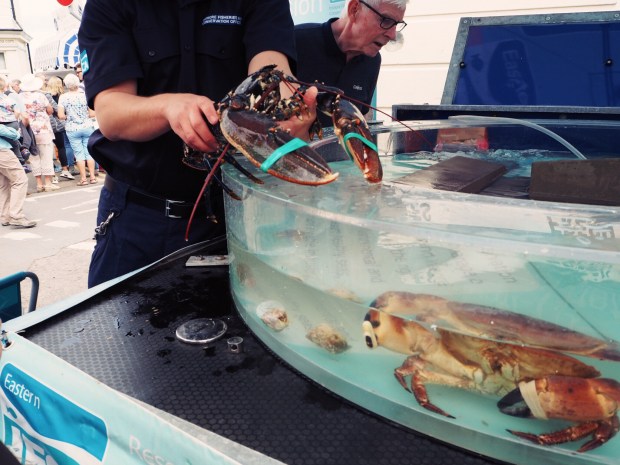 In Sheringham children were being entertained by Razz the Clown and Auntie Pearl and the Eastern IFCA’s amazing giant fish tank that held (believe it or not) various types of crab and a couple of HUGE lobsters. The team running the tank were friendly and answered all sorts of questions. AND they were brave enough to stick their hands into the tank! This guy may have been safe, but there were smaller crabs in there wandering freely that could have a good nip if they so wished!